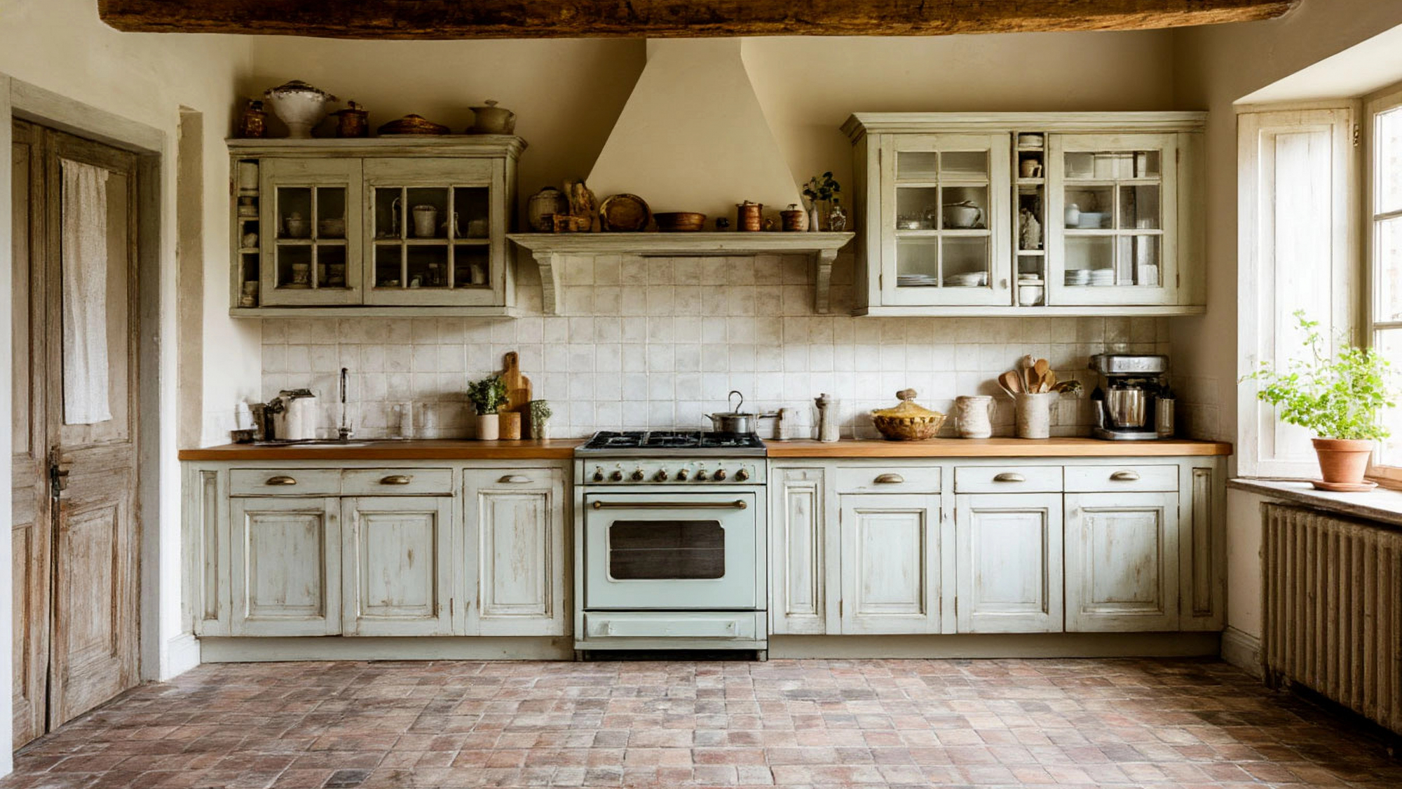 Фасады с лёгким налётом старины создают особую игру света — днём они кажутся чуть голубоватыми, а к вечеру становятся теплее, приобретая оливковый оттенок. Этот эффект живого цвета делает кухню по-настоящему уникальной: она словно живёт вместе с домом, подстраиваясь под его настроение. В сочетании с текстилем — кружевными занавесками, льняными салфетками, корзинами из лозы — интерьер обретает ту самую “домашнюю” магию, которая не подделывается и не проектируется искусственно.