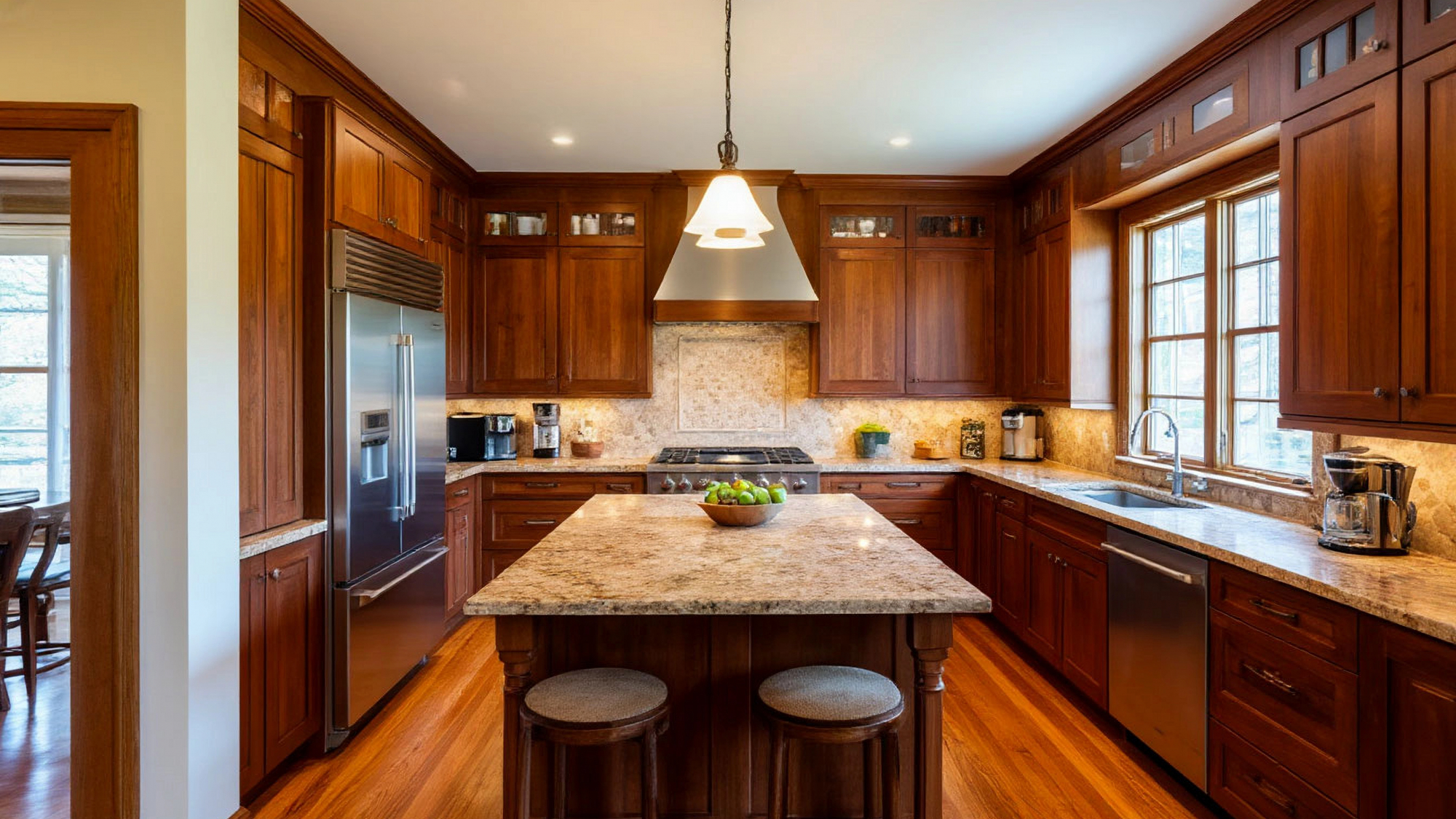 Классический стиль кухни "Вудстон" формирует особую атмосферу: она кажется одновременно строгой и гостеприимной, а теплые оттенки фасадов и натуральные материалы создают ощущение уюта и домашнего тепла. Это пространство, в котором приятно готовить, общаться с семьей и встречать гостей, наслаждаясь красотой интерьера и удобством планировки.