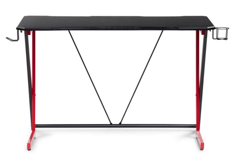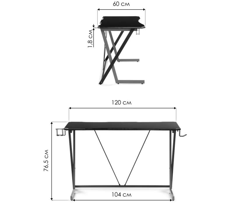 Поверхность столешницы покрыта меламиновой пленкой под карбон. Стол оснащен подстаканником и крючком для наушников. Расстояние между ножками: 104 см. Толщина столешницы: 1,8 см.